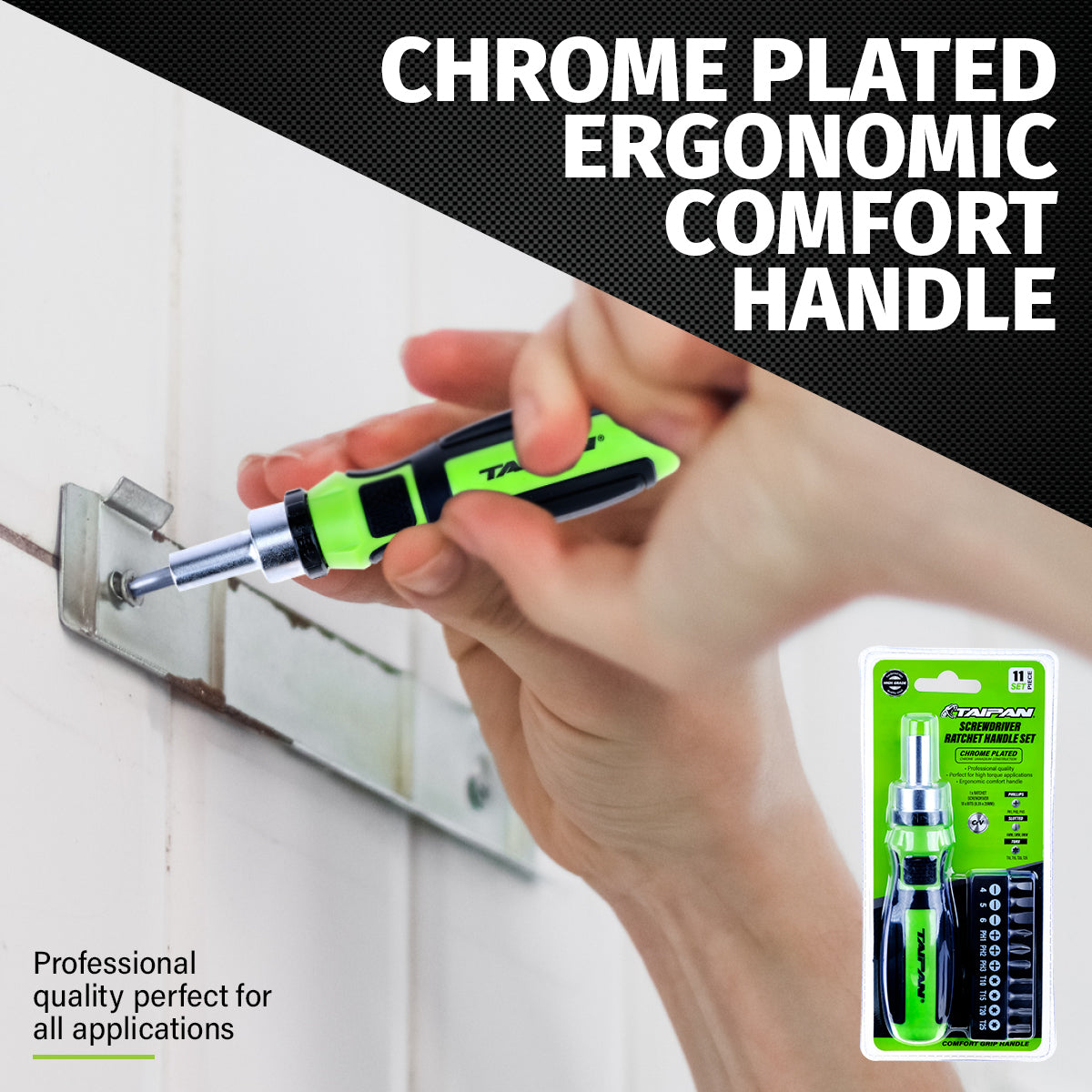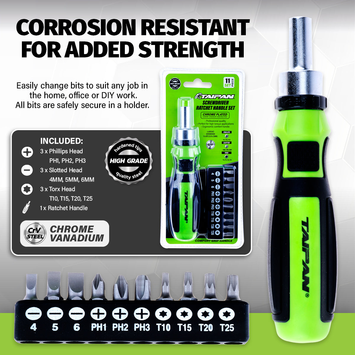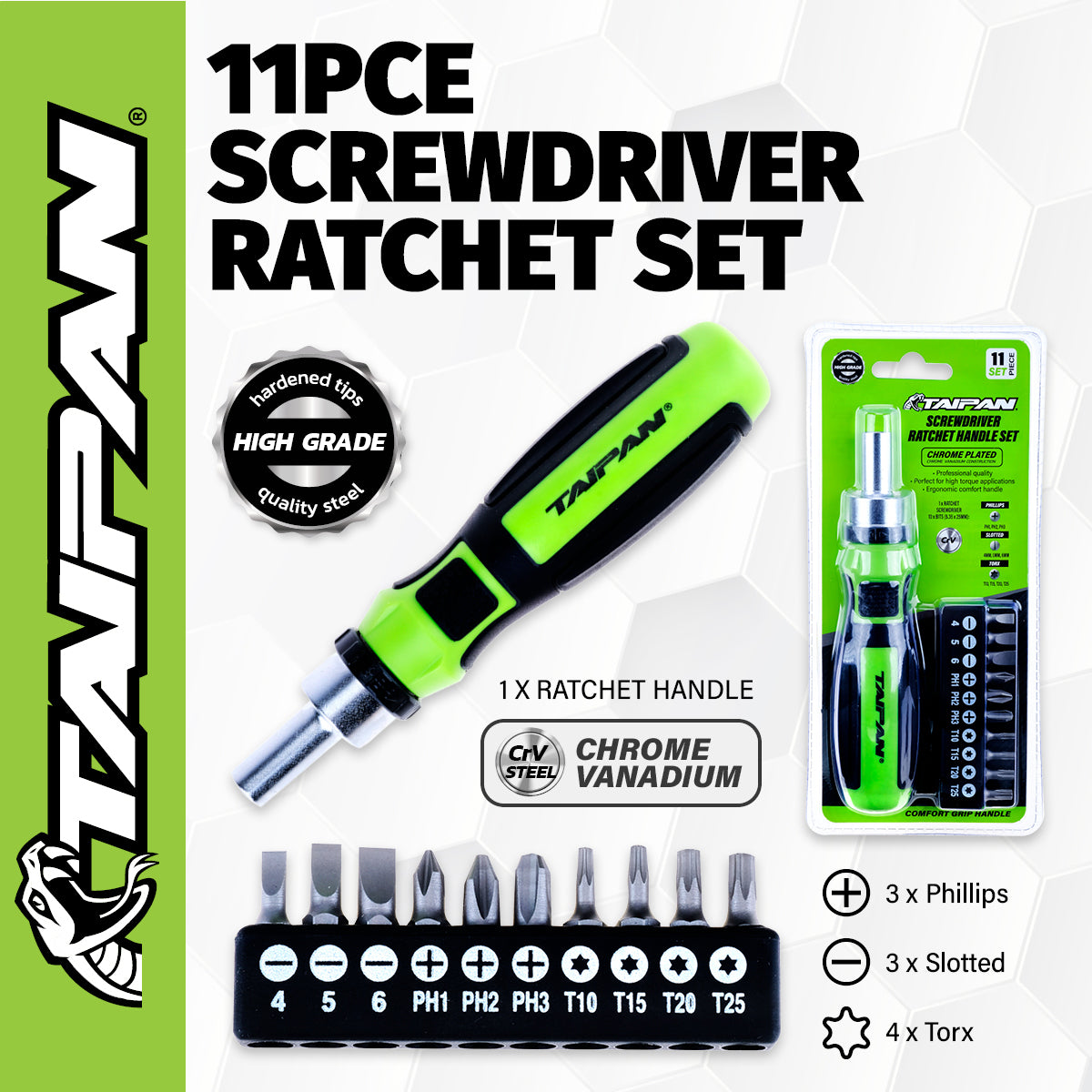 Taipan An impressive 11 piece screwdriver ratchet set containing an assortment of phillips, slotted and torx heads. Featuring premium quality chrome vanadium steel parts, this exceptional tool set has a holder for all bits for storing. A functional and convenient set for any toolbox.