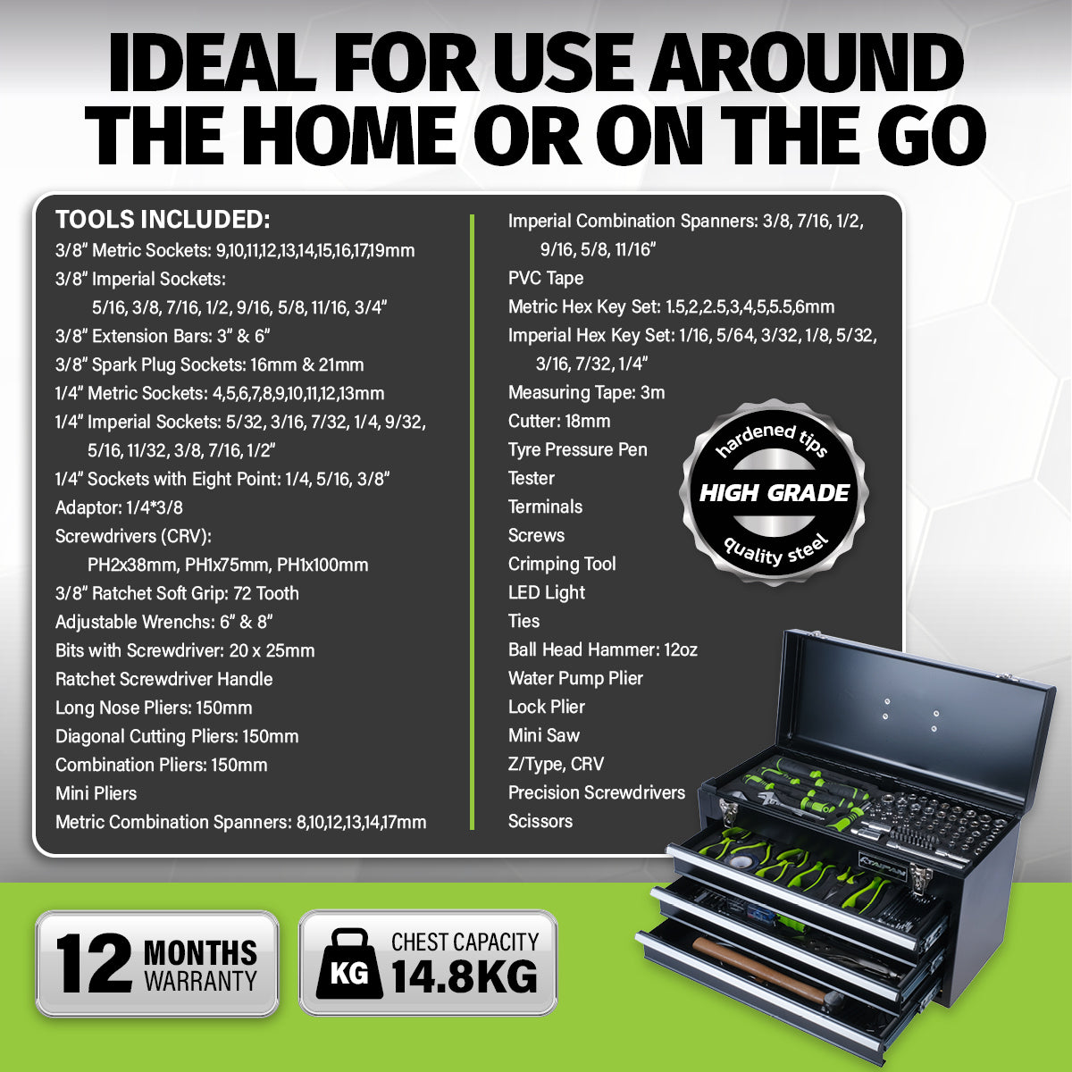 Taipan An impressive 3 drawer tool chest kit containing an assortment of handy and useful tools. Featuring premium quality chrome vanadium steel tips, this exceptional tool set has a solid and sturdy case with a convenient carry handle. All tools rest neatly and securely inside the case, making it easy to select the tool you require with ease.