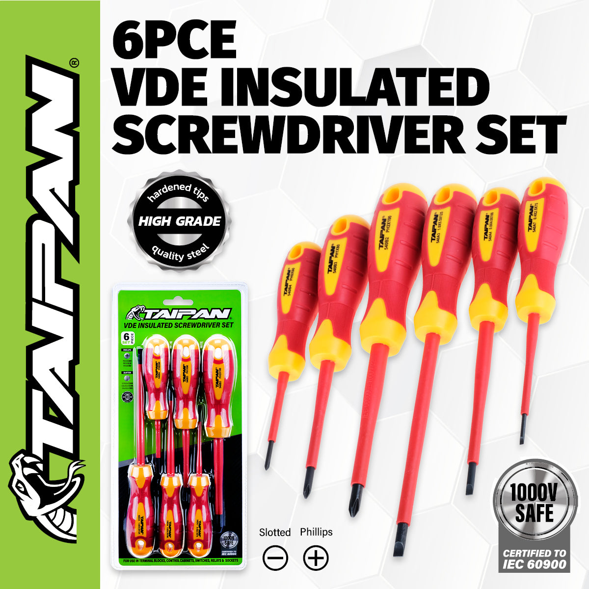 Taipan Quickly and efficiently complete screw tightening or loosening tasks using these VDE insulated screwdrivers, manufactured to the highest standards for function and safety. 1000V safe and certified to IEC 60900 for all your electrical jobs