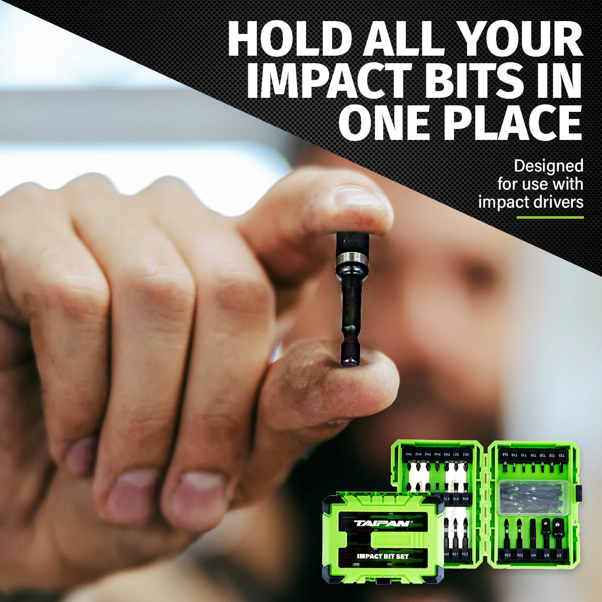 Taipan A handy and convenient impact bit set with magnetic tips constructed with chrome vanadium steel. Included is an impact resistant case with inner labelling to easily choose your required piece. Great for repairing and assembling various tasks and projects swiftly and effortlessly.