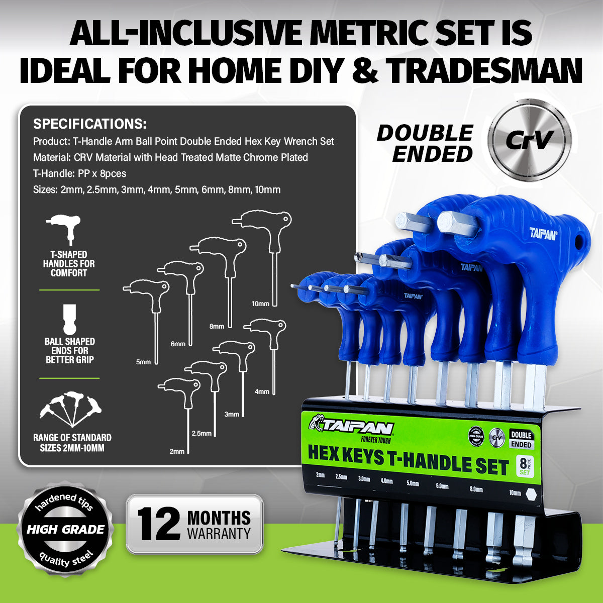 Taipan An impressive 8 hex keys t-handle set that are fitted with ball shaped ends. Constructed for strength and durability, these are ideal for mechanics, engineers and DIY enthusiats. This exceptional set has its own metal stand organiser to keep all 8 pieces together when stored.