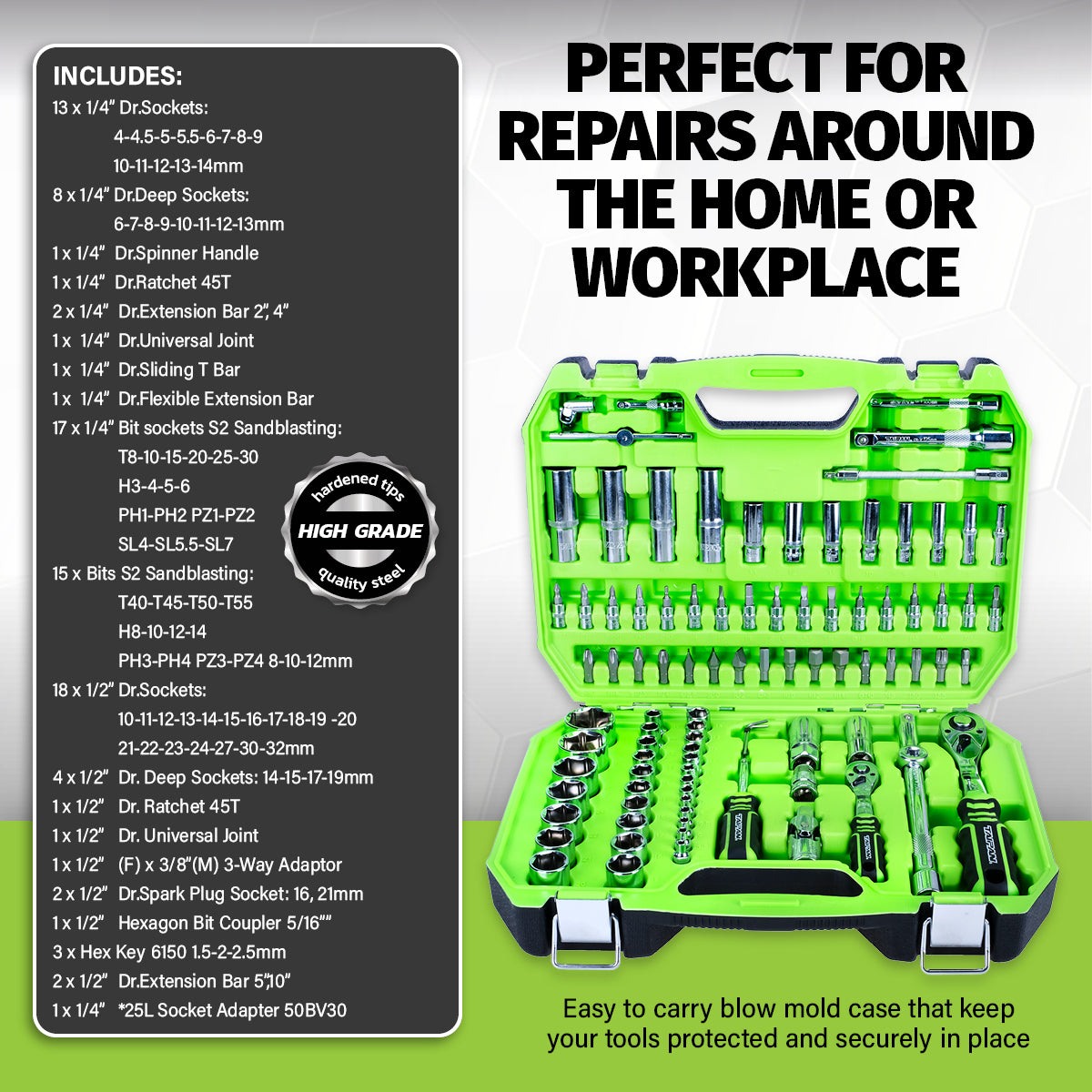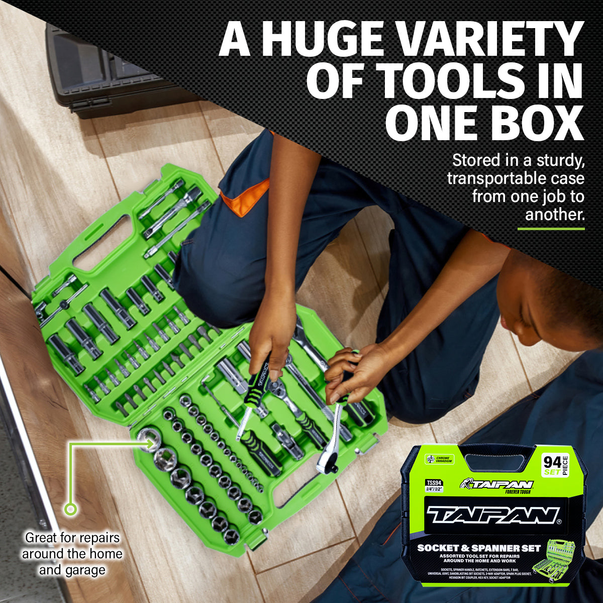 Taipan An impressive 94 piece spanner and socket set containing an assortment of handy and useful tools. Featuring premium quality chrome vanadium steel tips, this exceptional tool set has a solid and sturdy case with a convenient carry handle. All tools rest neatly and securely inside the case, making it easy to select the tool you require with ease.