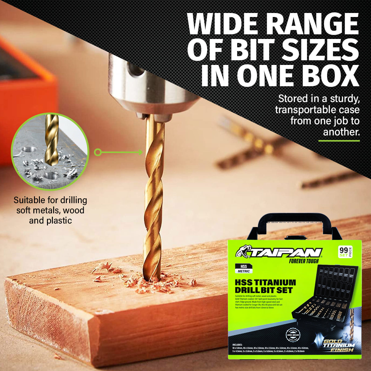 Taipan An impressive drill bit set with a gold titanium finish. Containing 99 pieces, this premium quality set is stored in a sturdy, transportable metal case. An exceptional drill bit set that is perfect for use with plastic, wood and mild steel.