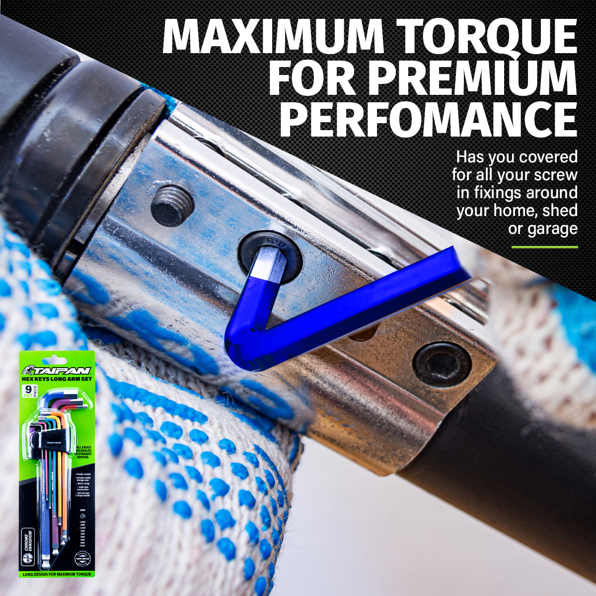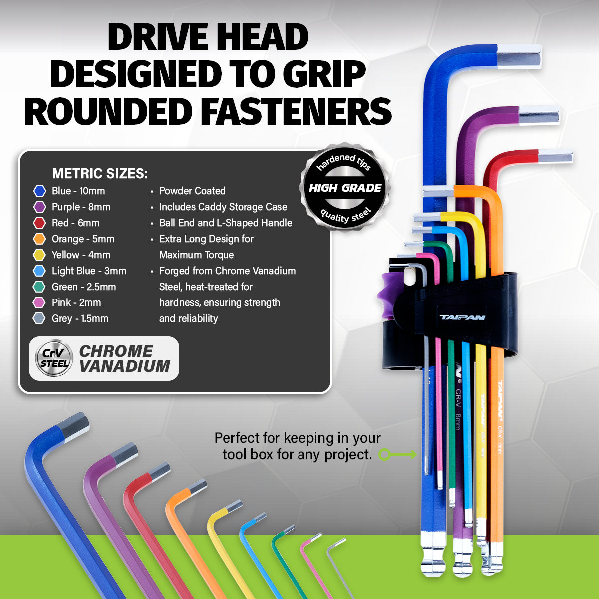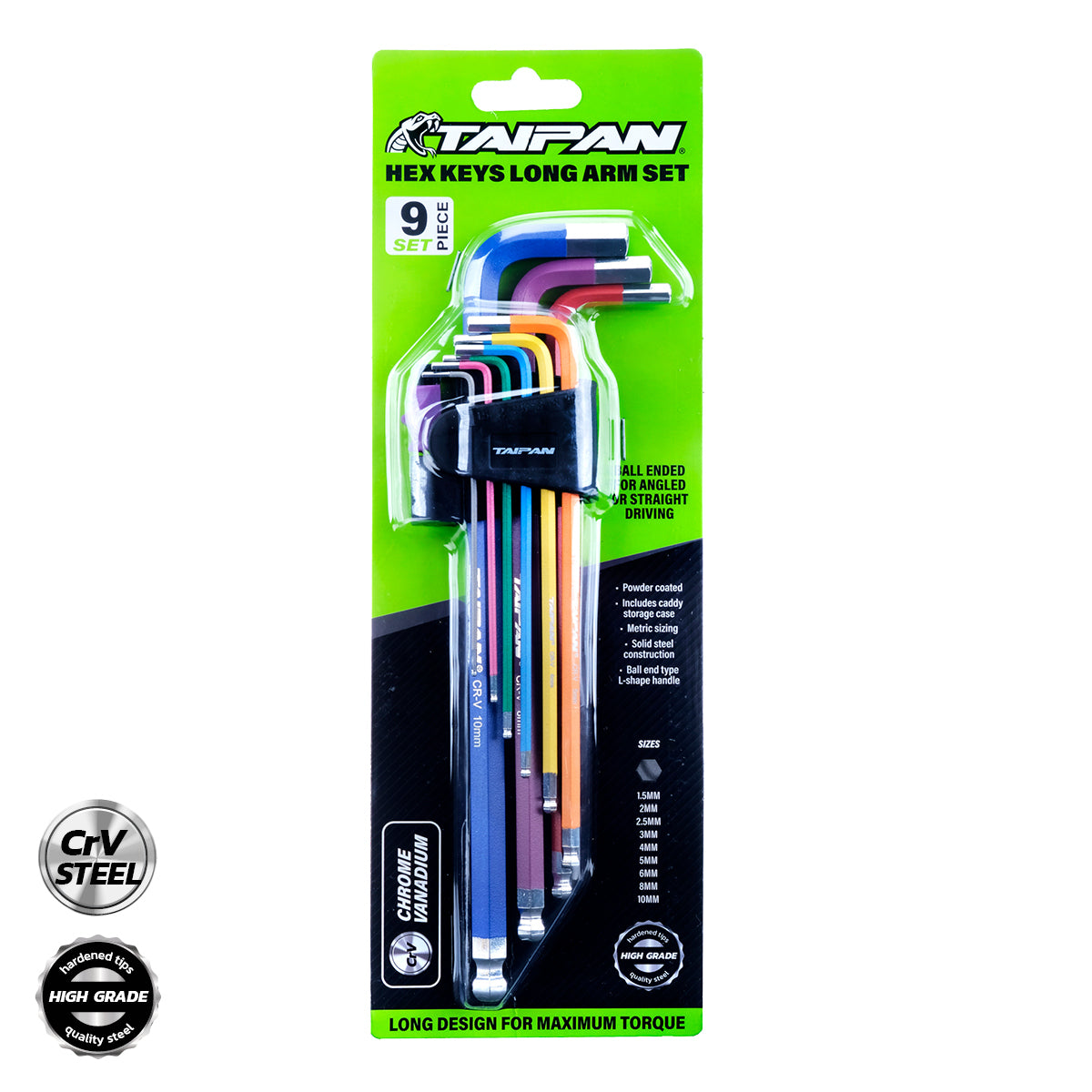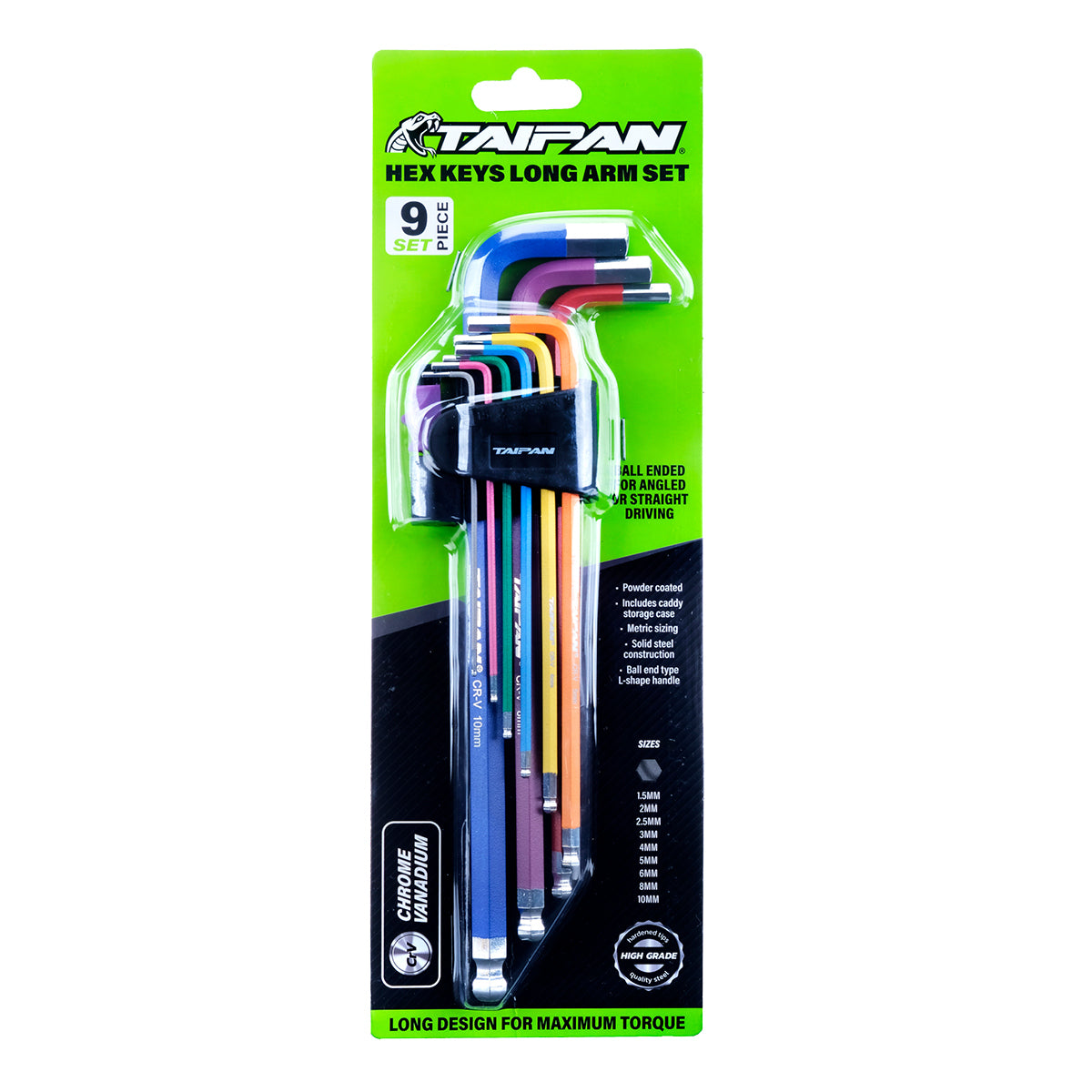 Taipan An impressive 9 hex keys, long arm set that includes its own caddy storage case. Fitted with ball ends and l-shaped handle, this hex set is colour coded for easy identification. Constructed for strength and durability, these are ideal for mechanics, engineers and DIY enthusiats.