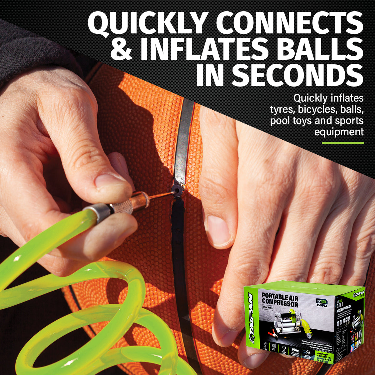 Taipan This handy 12V 150PSI compact air compressor quickly connects, is fast filling and comes with its own carry bag. Easy to operate hooking to your cars battery with the jumper cables, the set includes a range of screw on attachments to suit any job. Ideal for tyres, bicycles, sport equipment, toys and inflatables.