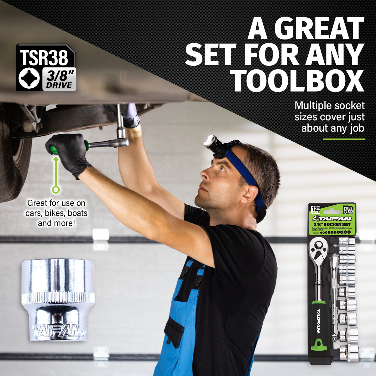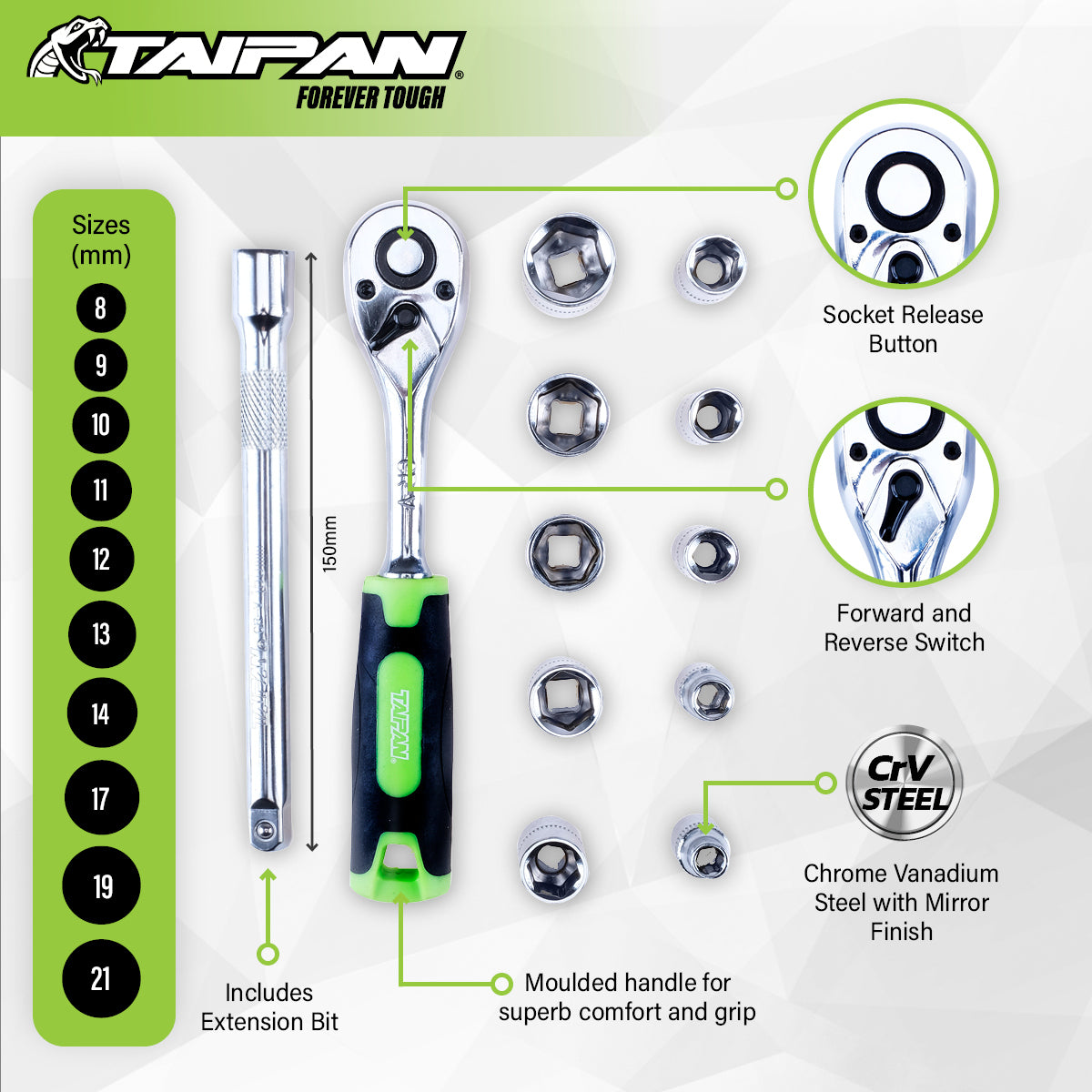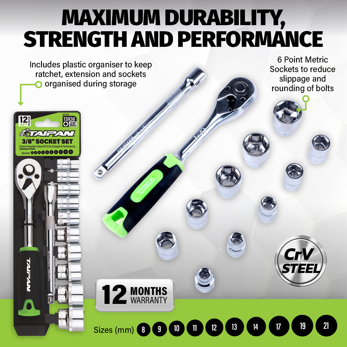 Taipan An impressive 12 piece 3/8\" ratchet and socket set containing an assortment of socket sizes for various lines of work. Featuring premium quality chrome vanadium steel parts, this exceptional tool set has an organiser to keep ratchet, extension and sockets organised when stored. A functional and convenient set for any toolbox.