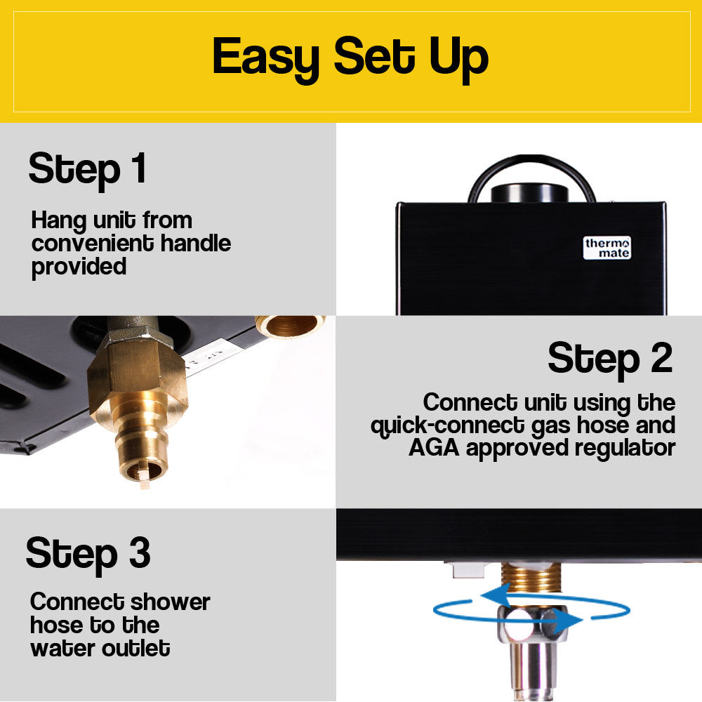 The Thermomate Tankless Outdoor Water Heater delivers endless hot water with optimal efficiency! No electricity is required, making this compact unit ideal for a hot shower when camping or caravaning, or for washing livestock or pets on a remote property.