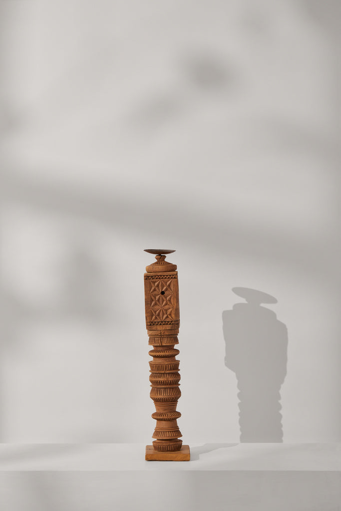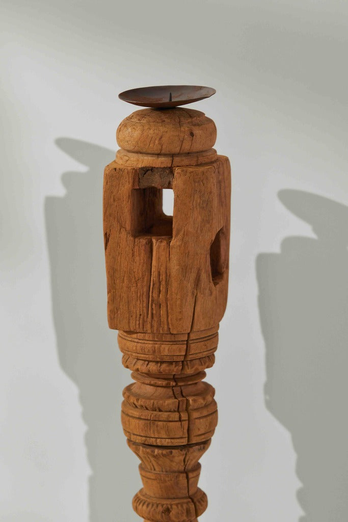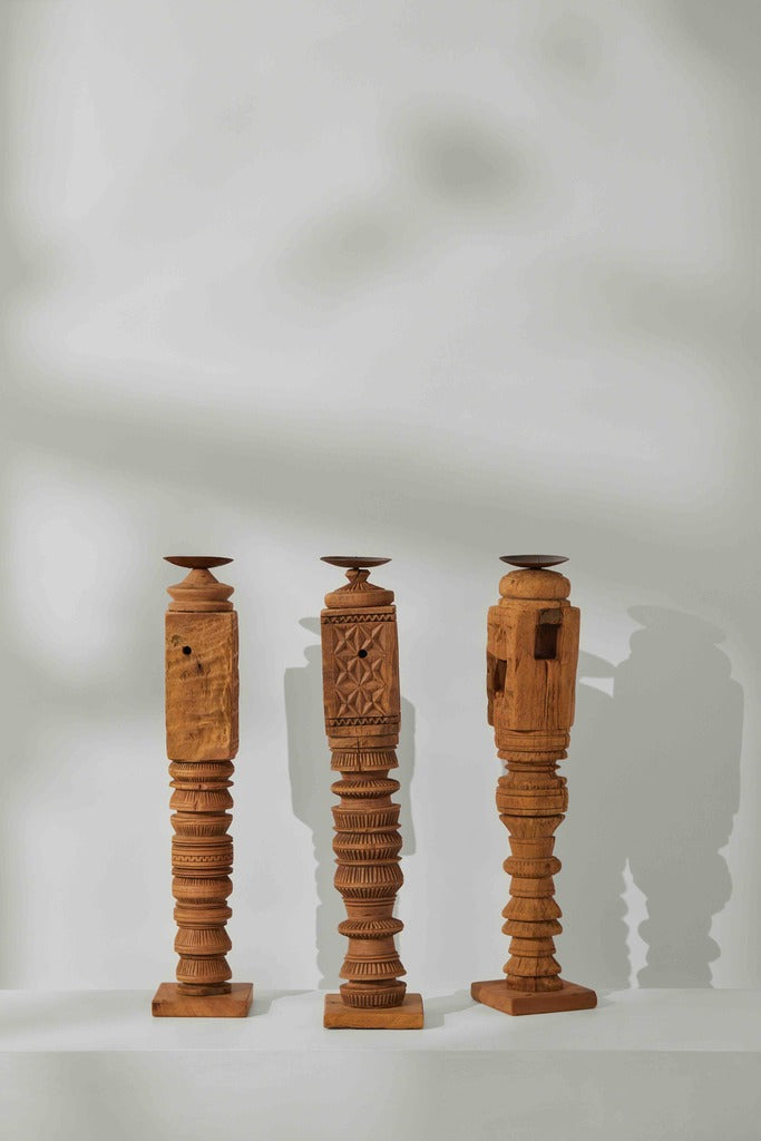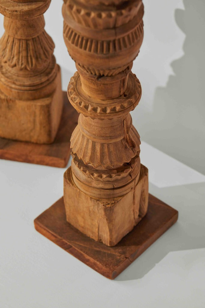 Immerse yourself in the captivating allure of our vintage Candle Holders (Medium), meticulously handcrafted from reclaimed Indian furniture pieces that have been transformed into unique and bespoke candle stands. These extraordinary pieces radiate character and cultural richness, adding a touch of raw and earthy elegance to any space. Whether placed on the floor with a chunky candle, perched on a shelf, console, or dining table, they make a striking impression