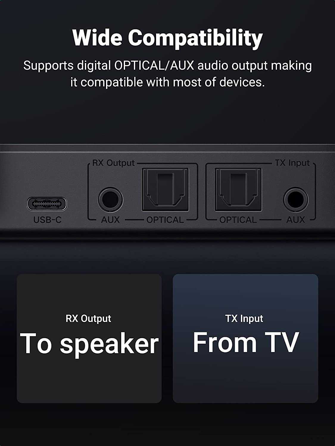 UGREEN Bluetooth Audio Adapter supports digital OPTICAL/AUX audio output making it compatible with most of devices. In Transmitter (TX) mode works with any TV that has an audio output port, and it can be paired with any headphone/speaker that's Bluetooth enabled. In Receiver (RX) mode, it can receive wireless audio signals from your iPhone, iPad or Android via Bluetooth and stream audio into any wired speaker system.