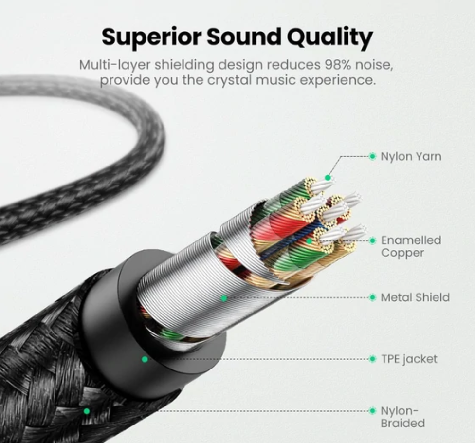 Gold-plated 3.5mm connector and high-polished aluminum connector,ensure to transmit sound stably and seamlessly. No fuzzy noise.