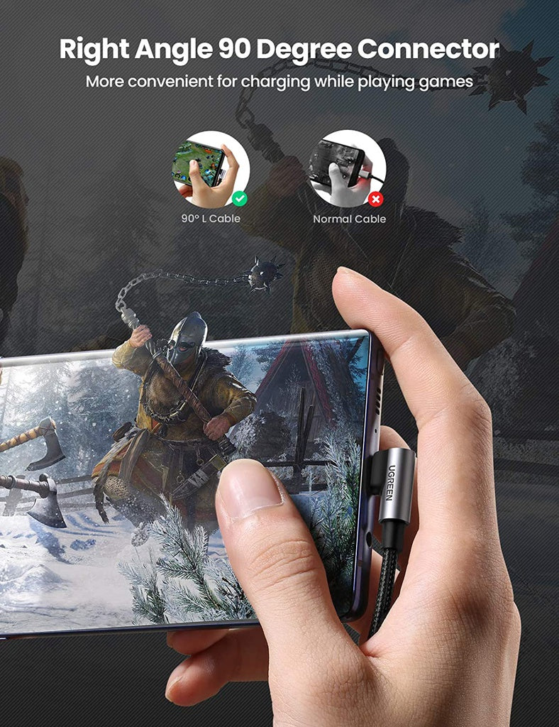 UGREEN 90 degree usb c cable is designed with an innovative 90 degrees L connector, more convenient and comfortable for playing games, watching videos, reading e-books when you lie on the couch or bed while charging. Important Note: Please keep this usb c charger cable and your phone charging port clean and dry for safer charging.