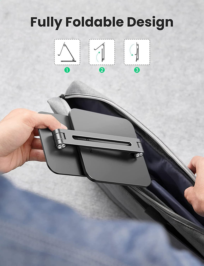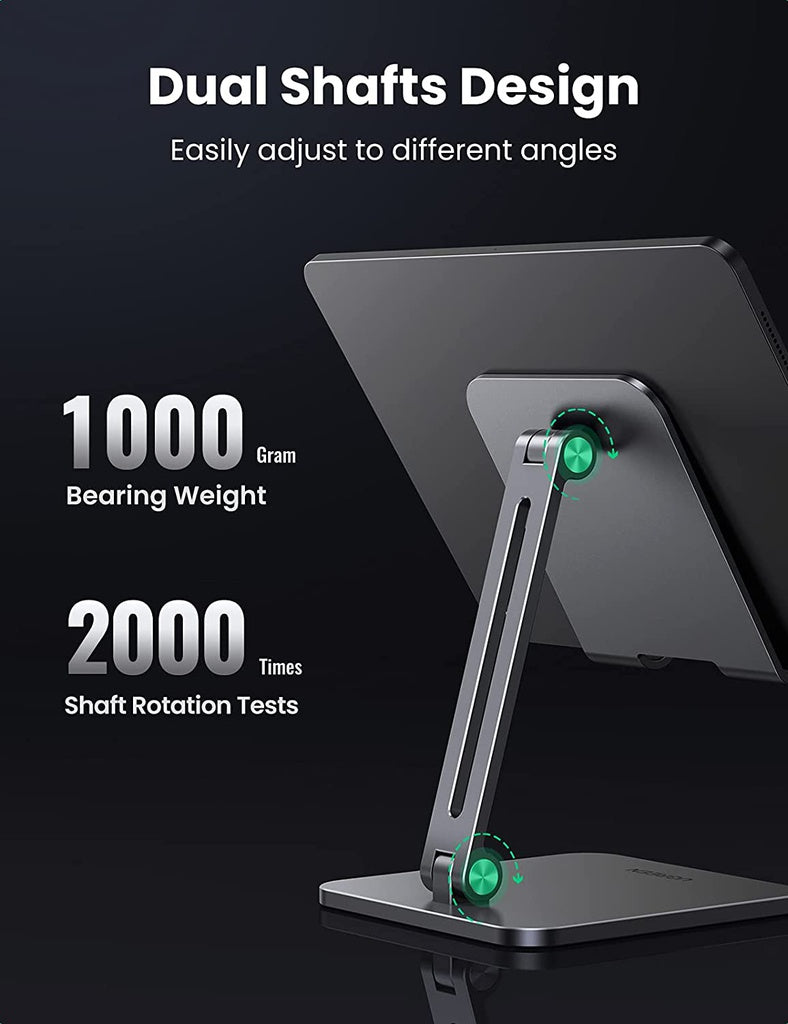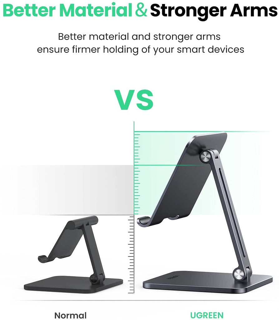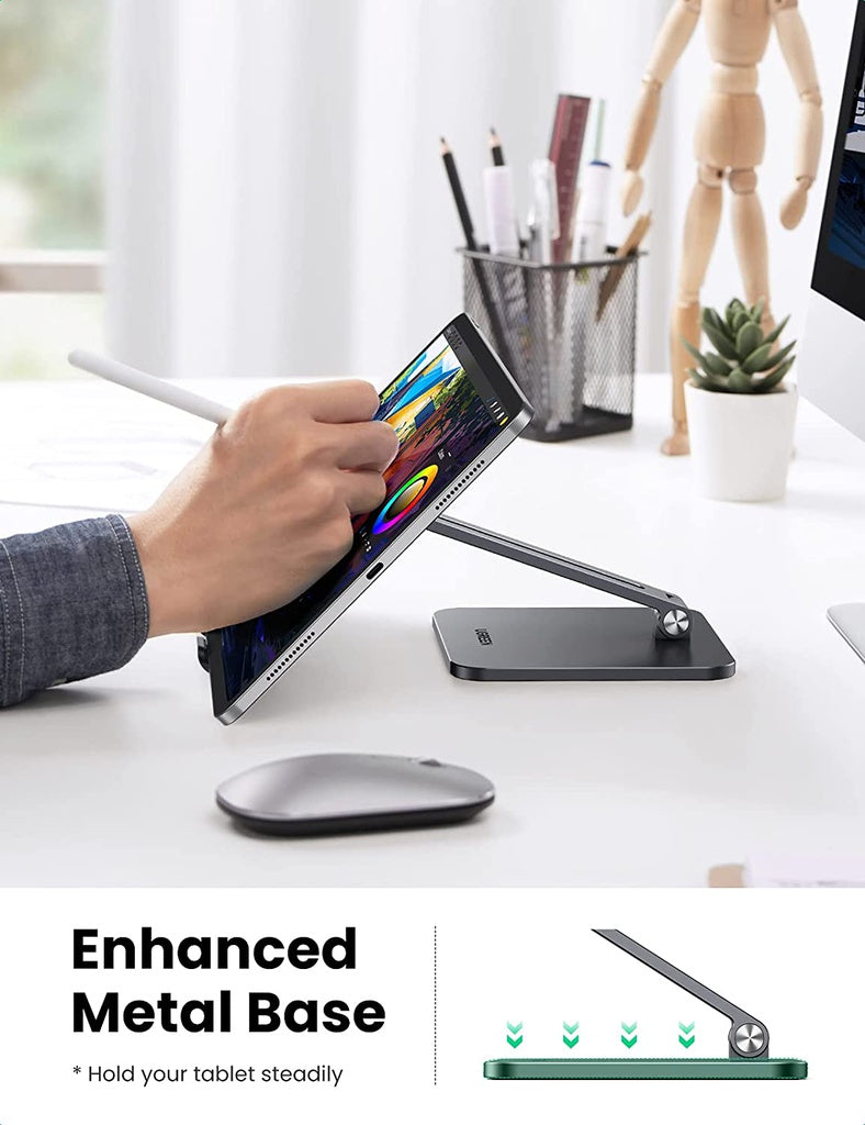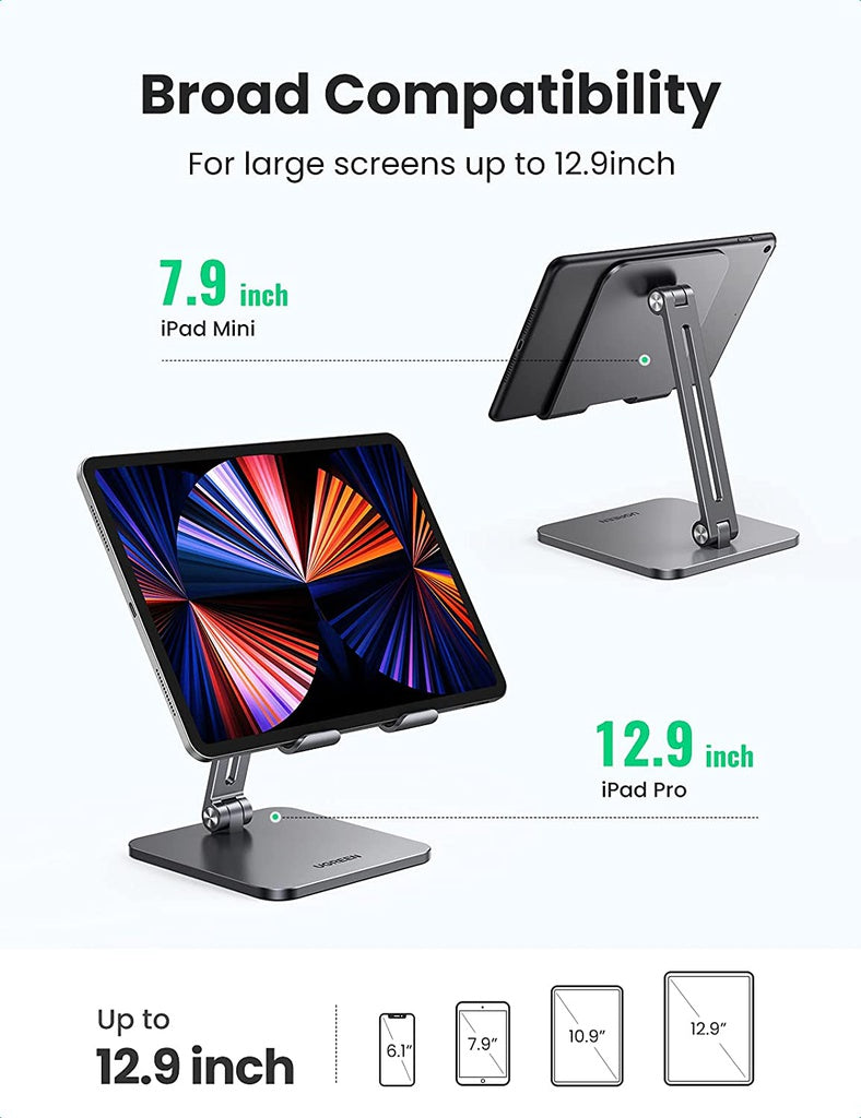 This UGREEN desk tablet holder with double hinges allows variable position settings at any angle. Perfect for setting up a tablet or mobile phone when traveling or business trip.