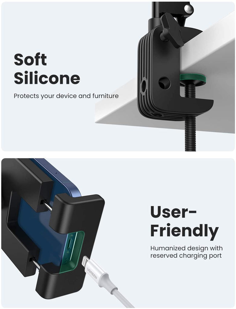 With 360 degree rotating flexible mount, 2-stage sturdy and adjustable aluminum alloy arm, it could be adjusted at the ideal distance and angle with convenient viewing.