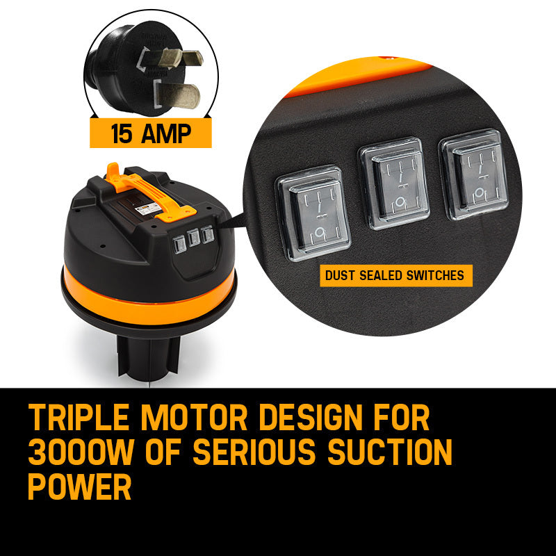 With the power of three motors combining to provide a massive 3000W, and with a 100L capacity this Unimac Wet and Dry Vacuum is ideal for performing high volume cleaning in commercial premises, such as workshops, hotels, and warehouses.