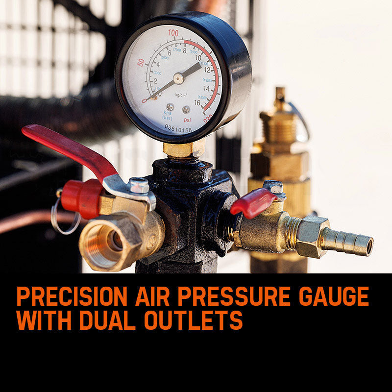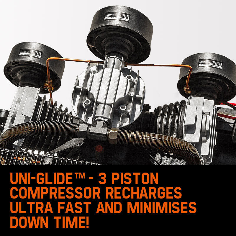 What sets Unimac apart from the rest is the huge triple 90mm Uni-GlideTM coated sleeves in a Tri-V layout with twin belt drive. When you are working on a project, you have to consider the moisture and air temperature which affects the performance of your air compressor and quality of air delivered. Unimac's patented Tri-V Triple piston with Uni-Glide™ Coated Sleeves is designed to have larger pistons operating at a much lower speed, which means lower rotations per minute directly result in lower operating temperatures. Larger pistons with lower temperature come with lesser moisture, not only prolonging the life of your air compressor, but also your valuable air tools - this is also super critical for spray painting applications for that perfect paint finish every time.