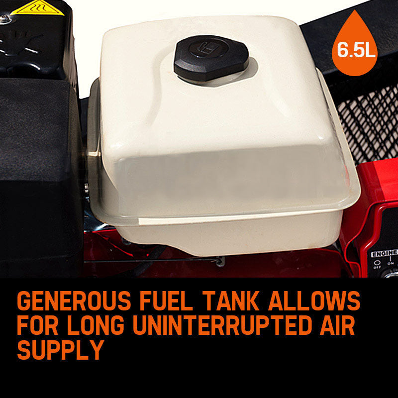 This impressive unit is powered by an ultra dependable 18HP petrol powered OHV engine. Couple this with the oversize 150L receiver and you've got a workhorse that has the ability to maintain a strong 115PSI even under the most demanding load! The high capacity 6.5L fuel tank and 1180L/min free air delivery ensures you will not find a better solution for maximum volume air supply.