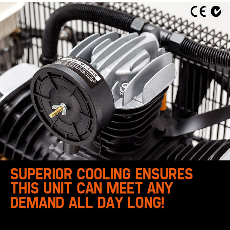 What sets Unimac apart from the rest is the huge triple 90mm Uni-GlideTM coated sleeves in a Tri-V layout with twin belt drive. When you are working on a project, you have to consider the moisture and air temperature which affects the performance of your air compressor and quality of air delivered. Unimac's patented Tri-V Triple piston with Uni-Glide™ Coated Sleeves is designed to have larger pistons operating at a much lower speed, which means lower rotations per minute directly result in lower operating temperatures. Larger pistons with lower temperature come with lesser moisture, not only prolonging the life of your air compressor, but also your valuable air tools - this is also super critical for spray painting applications for that perfect paint finish every time.