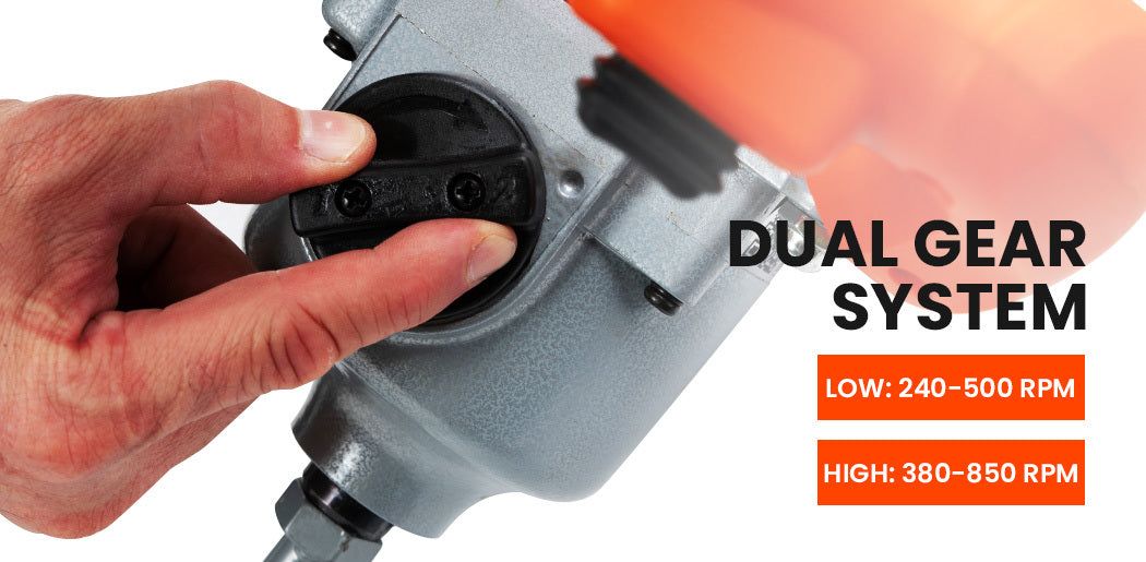 No-load frequency speed: Gear 1 = 180-380rpm, Gear 2= 300-650rpm