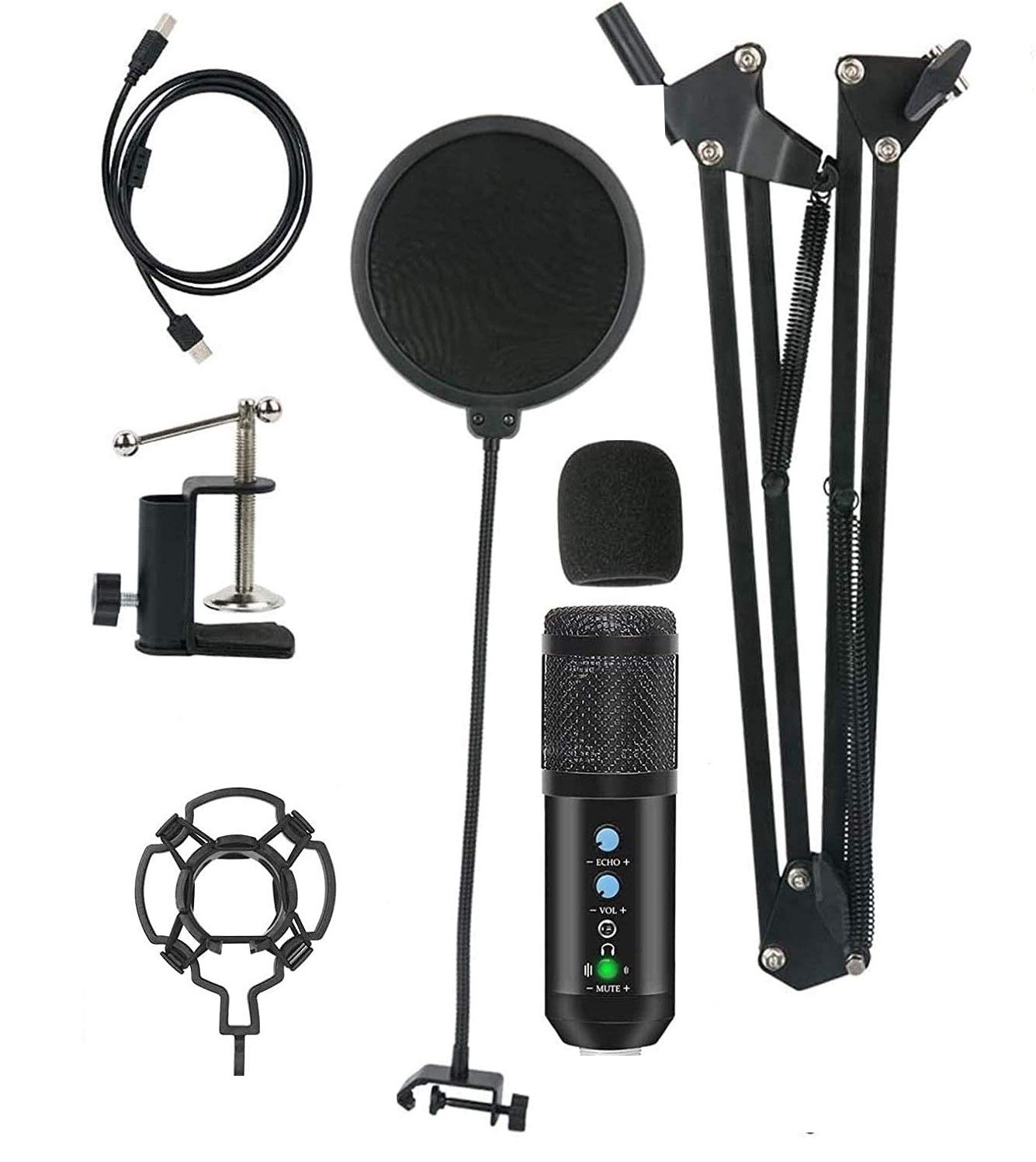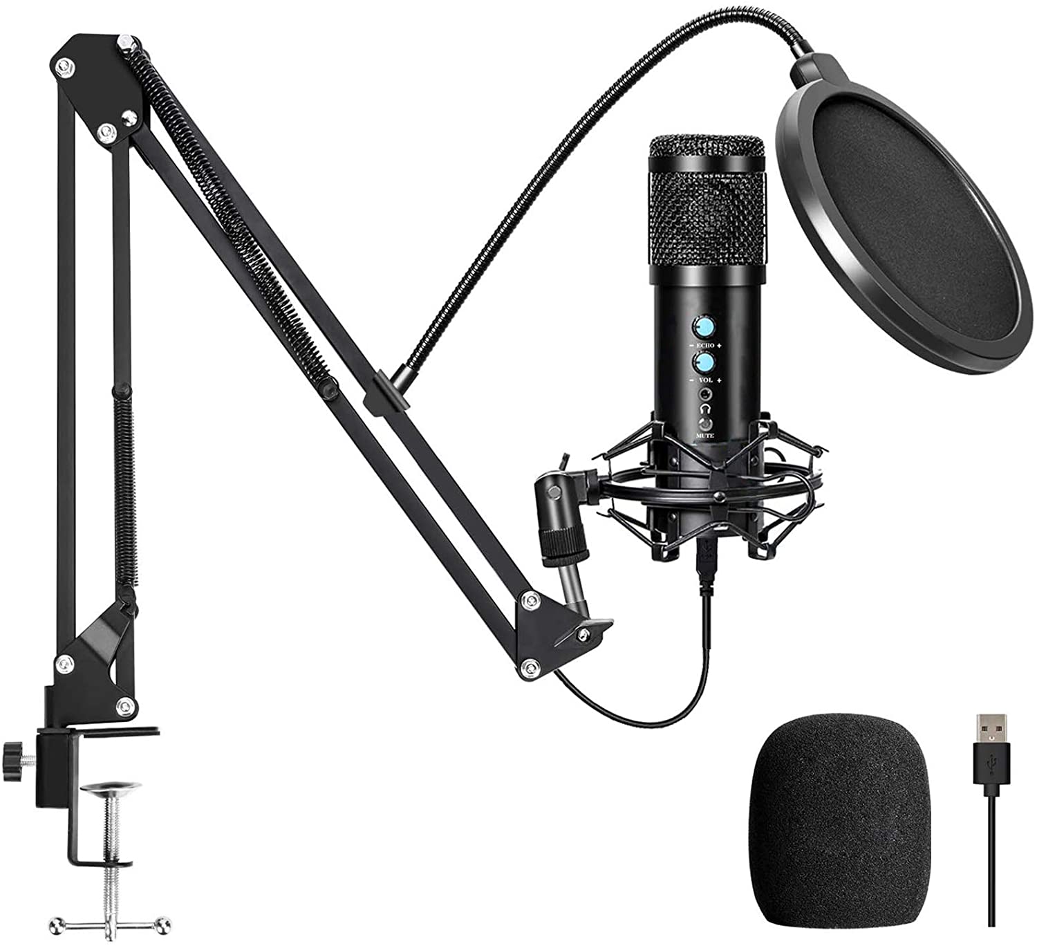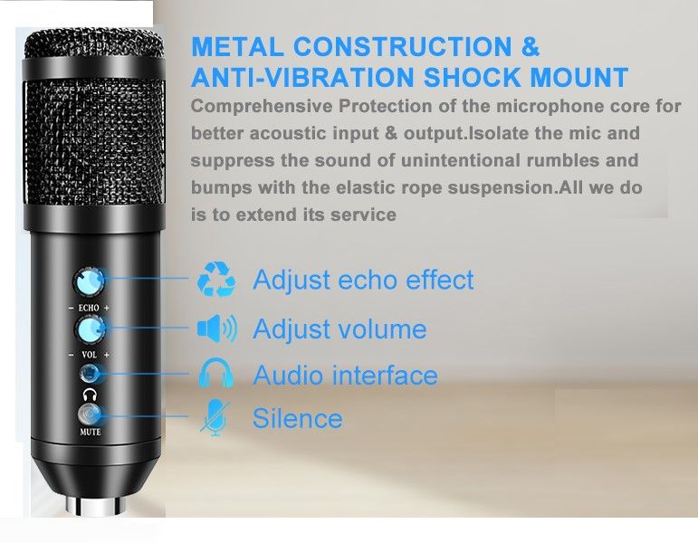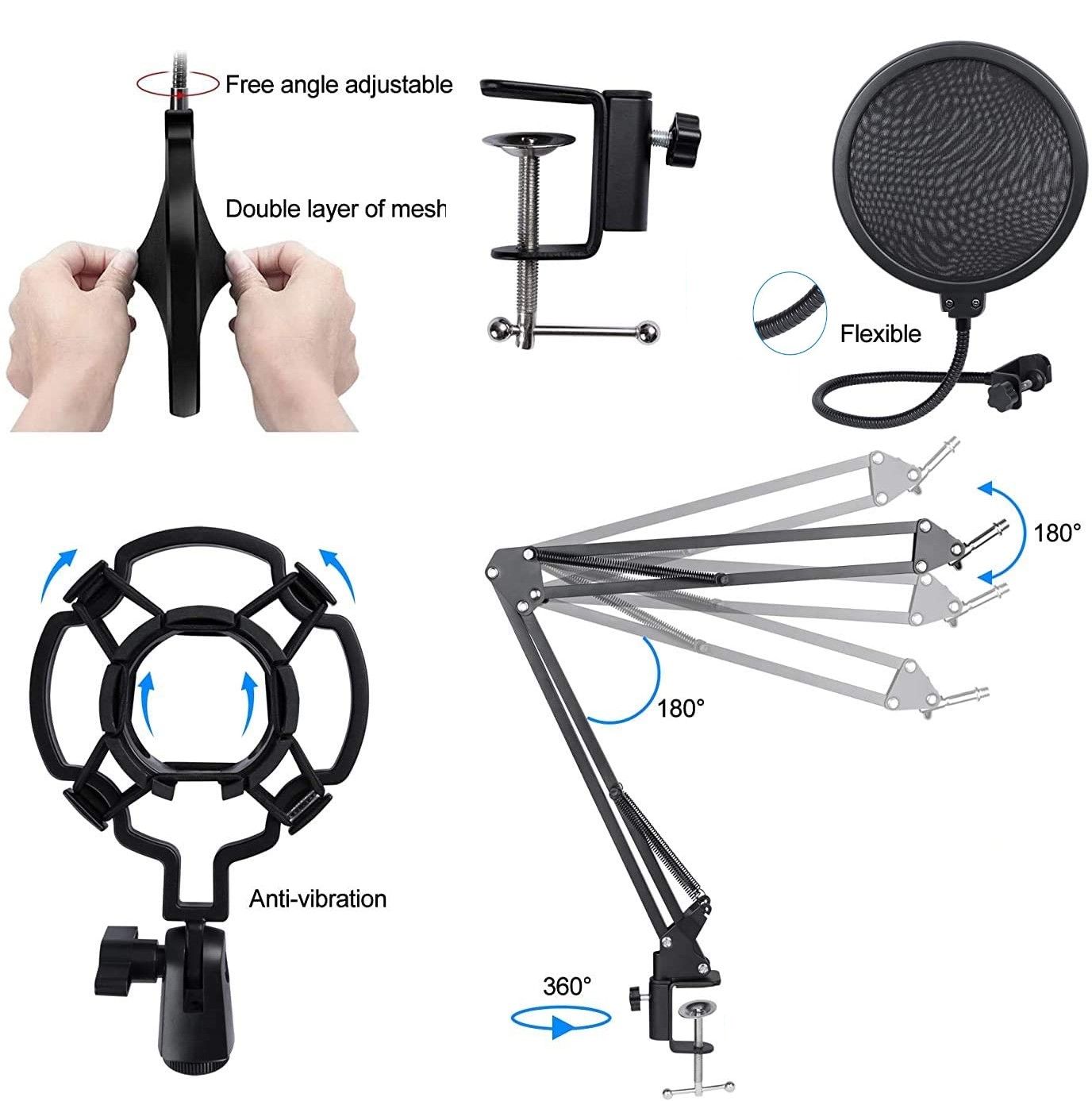 - Packing list+After-sales: The USB microphone kit includes Condenser Mic + Adjustable Mic stand + Shock Mount + Pop Filter + Foam Mic Windscreen + usb Cable If for any reason you are not happy with this product, please contact us, we provide 45 days of free returns and 360 days of warranty service.