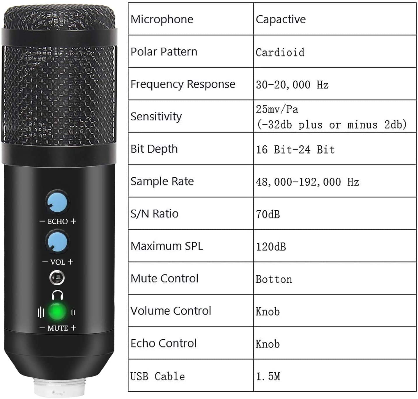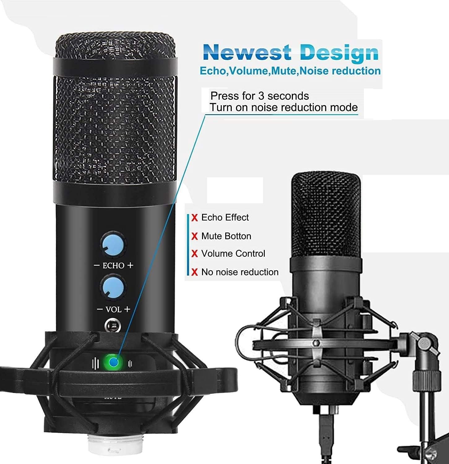 - Upgraded design: Mute key and Noise reduction Mode, the built-in LED Indicator lights to tell you the working status (Blue Light: Working, Red Light: Mute). Long press mute key 3s to switch noise reduction mode can effectively block the background noise.Gain/Echo Control: Adjust Mic with the easy-to-reach knob, Make the mic to reach a perfect voice.Perfect for audiovisual electronic musical instruments and various applications operating life up to 15000 cycles.
