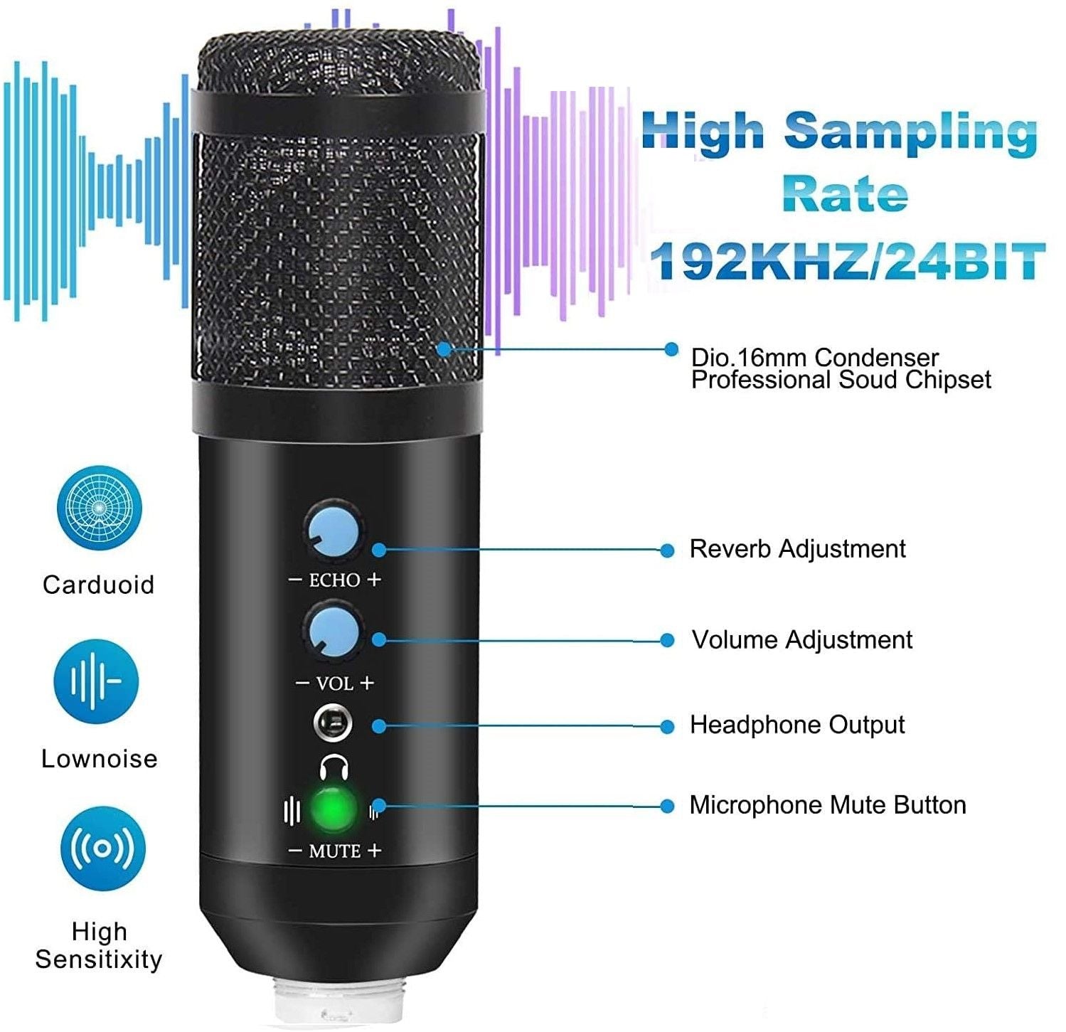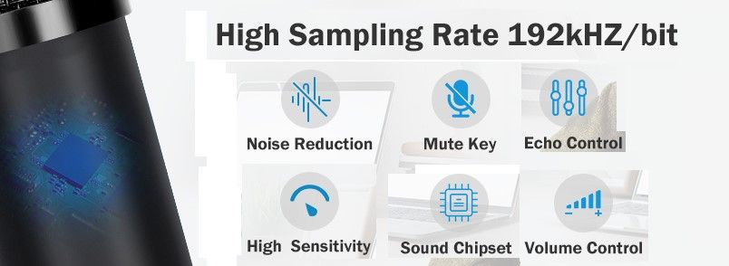 - Excellent Sound Quality: The high sample rate of 192kHz/24Bit and wide frequency response(30Hz-20KHz) precisely reproduce every details of your sound while 16mm large diaphragm offers clean and crisp audio instead of muffled sound. The cardioid condenser capsule enables the Mic to capture pristine and accurate sound and cancel noise from surroundings, perfect for recording and communicating.With higher sensitivity than other mics, you'll be heard louder even in the same recording distance.