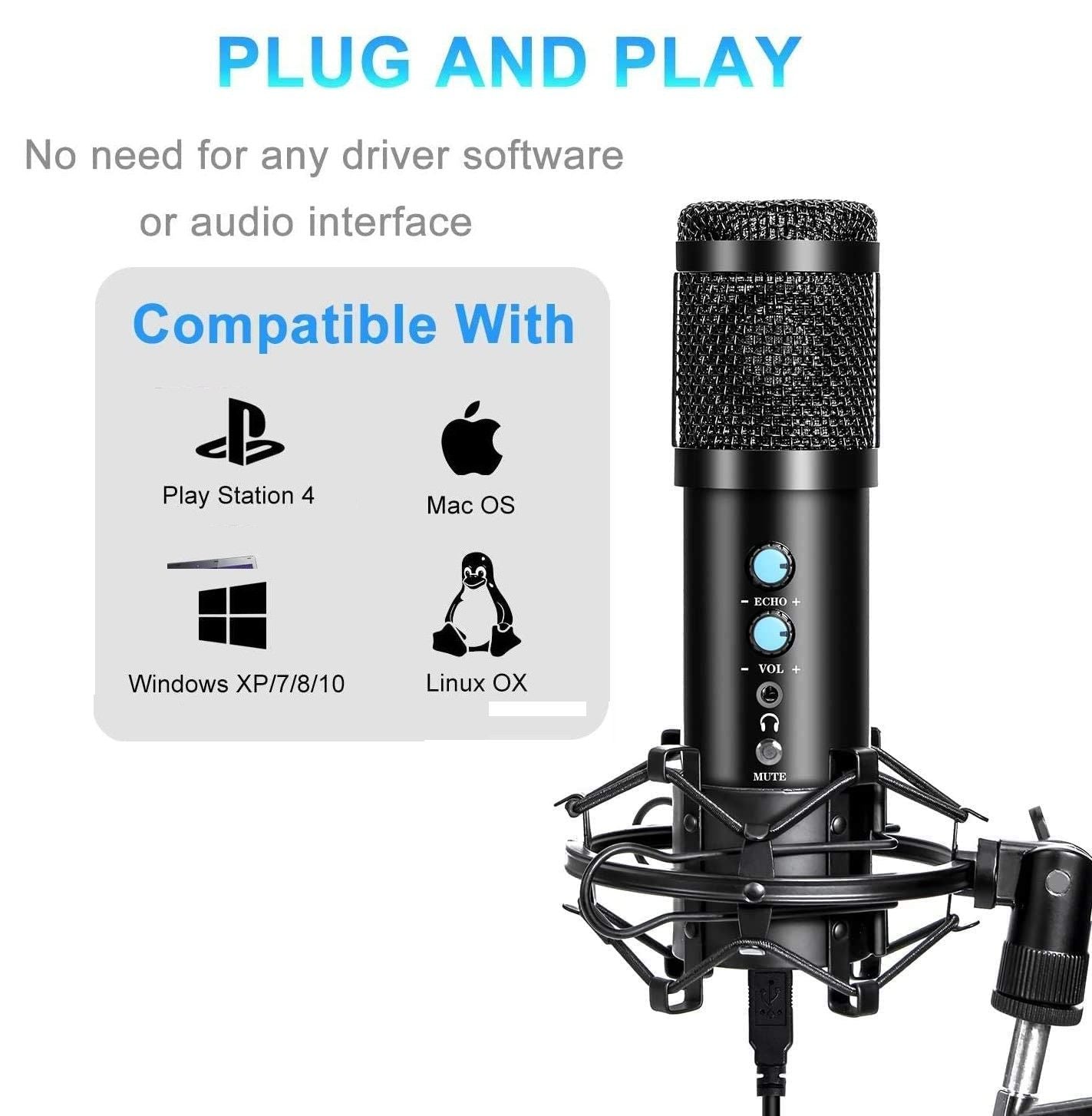 - USB Plug and Play: Plug the USB port of the microphone directly into your laptop or desktop computer.built-in sound card, no drivers to install, hassle-free installation,This microphone is compatible with Windows XP/7/8/10, and Mac OS and Linux OX.