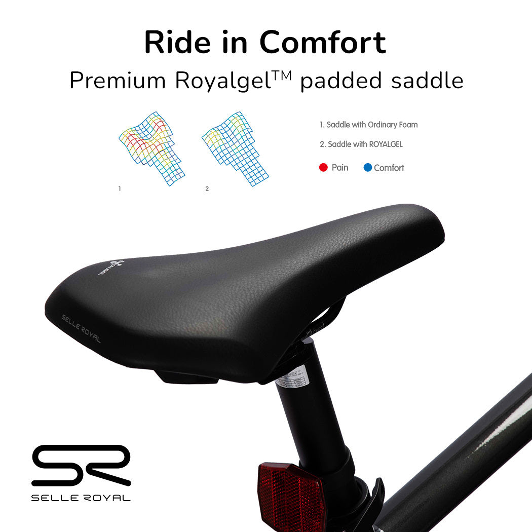 Clocking up the kilometres on a Metro 5 + e-bike is a pleasure with riding on the Selle Royal saddle which boasts a gel layer. Your palms rest on ultra-soft oversized handlebar grips and the pedals are also rubber coated for added comfort.