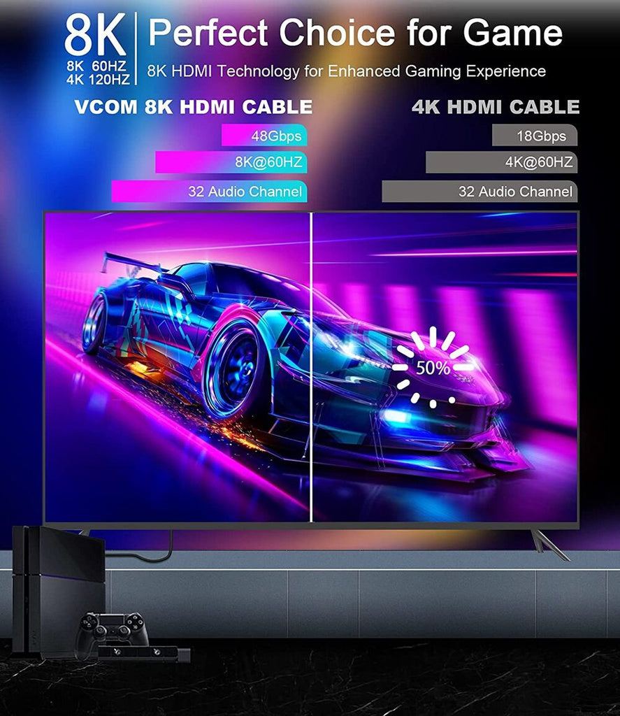 Supports 3D, Ethernet and Audio Return and resolutions up to 8K, 2160p, 1440p, 1080p, 1080i, 720p, 480p, and 480i. Compatible with all HDTVs, Blu-ray players, Xbox, PlayStation and other HDMI devices.