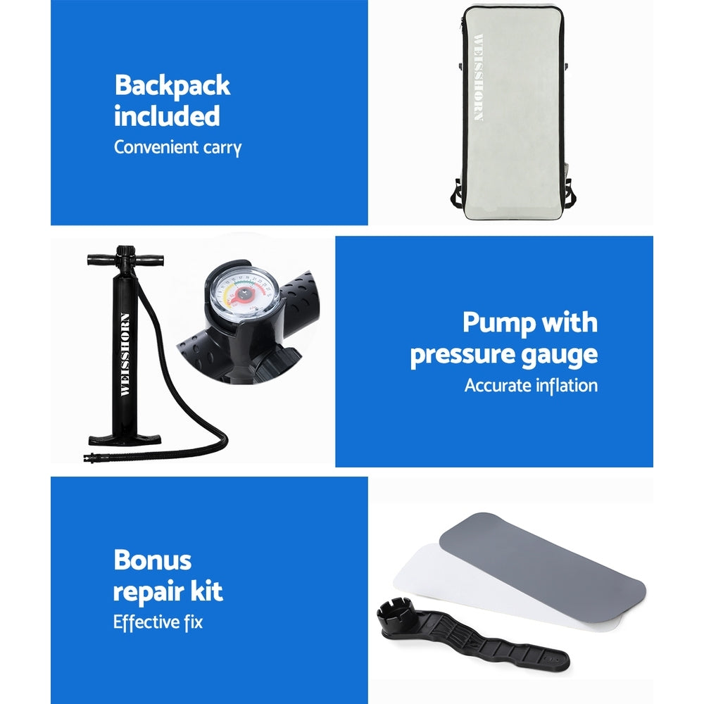 Our Weisshorn Stand-up Paddle Board is designed to suit the beginner paddler as well as a seasoned and easily fits both paddler and passenger for hours of maximum enjoyment. Better still, it is made from durable drop-stitch core material and easy to inflate and deflate, with similar build qualities that you will find with its pricier fibreglass counterparts. It maintains rigidity and toughness with a thickness of 15cm and has a weight capacity of up to 185kg. The supplied 1.7m adjustable aluminium paddle is highly versatile in both paddling and steering while the three fins underneath the board ensure steady gliding, easy manoeuvrability and smooth turning. In fact, one of the fins is removable to give better directional stability. Getting your aquatic escapades started with the paddle board is a simple task of inflating it with the included pump and you are good to row. And because it can be packed away into its handy travel bag, you can take the paddle board just about anywhere you want to go for your water adventures. Also included is a repair kit and a quality adjustable kayak seat that can turn your paddle board into a kayak to enhance your comfort. The kayak seat also comes with a free detachable seat bag where you can conveniently place your personal belongings.