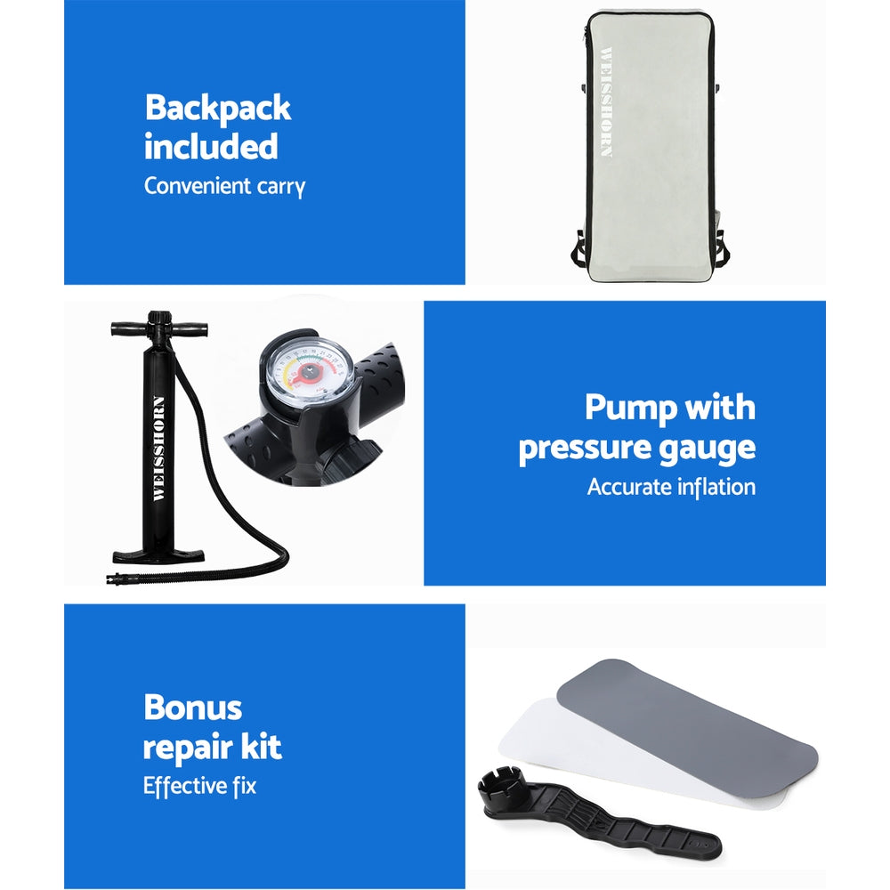 Our Weisshorn Stand-up Paddle Board is designed to suit the beginner paddler as well as a seasoned and easily fits both paddler and passenger for hours of maximum enjoyment. Better still, it is made from durable drop-stitch core material and easy to inflate and deflate, with similar build qualities that you will find with its pricier fibreglass counterparts. It maintains rigidity and toughness with a thickness of 15cm and has a weight capacity of up to 185kg. The supplied 1.7m adjustable aluminium paddle is highly versatile in both paddling and steering while the three fins underneath the board ensure steady gliding, easy manoeuvrability and smooth turning. In fact, one of the fins is removable to give better directional stability. Getting your aquatic escapades started with the paddle board is a simple task of inflating it with the included pump and you are good to row. And because it can be packed away into its handy travel bag, you can take the paddle board just about anywhere you want to go for your water adventures. Also included is a repair kit and a quality adjustable kayak seat that can turn your paddle board into a kayak to enhance your comfort. The kayak seat also comes with a free detachable seat bag where you can conveniently place your personal belongings.