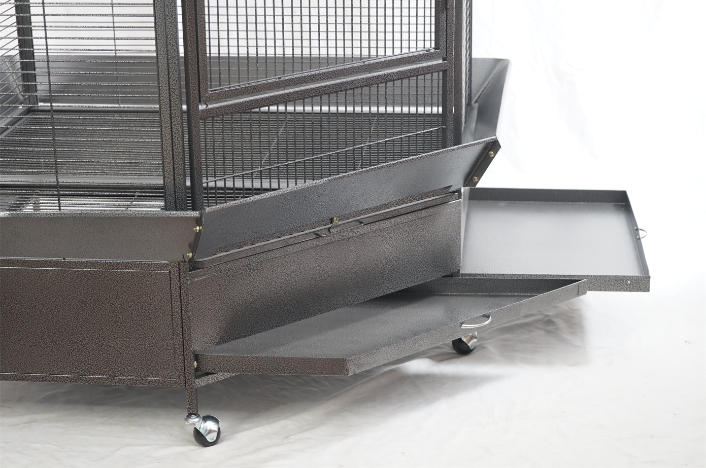 Taking care of them is made easy too with one large access door and four side doors to reach inside four food and water bowls and take them out for refills or cleaning. Cleaning is hassle-free with the slide-out top and bottom tray that can also be removed. And your feather friends will feel extremely safe too with a set of secured locks to keep prying predators away.