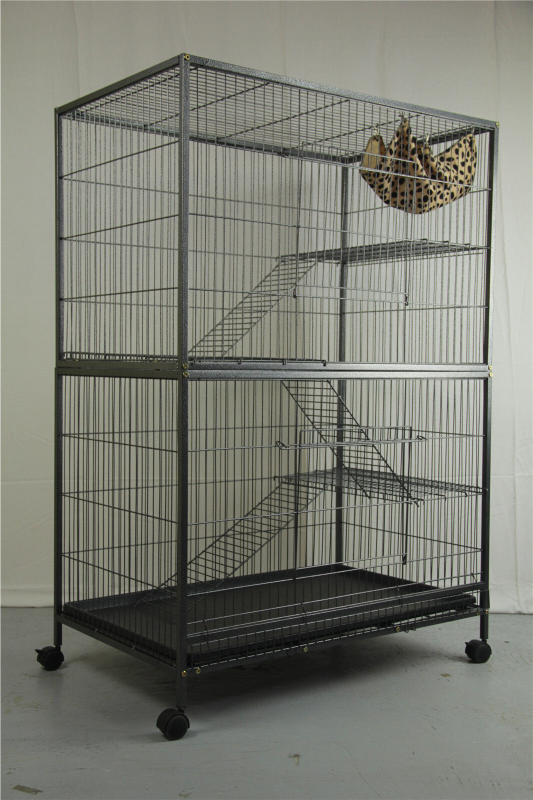 This fantastic, spacious multi-level animal Cage is definitely the most comfortable roost for your little one. Our cage is made of high quality metal with vein powder coating so it is tough and durable. The dimension of this cage is 95 cm x 59 cm x 140 cm, which provides sufficient space and multi-area for your pets. This brand new multi-level ferret cage is in black vein, and 3 removable platforms, 3 removable ladders, and a funky hammock for rest and relaxation. The locks at the bottom of the cage secure animal from being escaped. In this package, it includes 4 smooth castor wheels which provide great mobility.