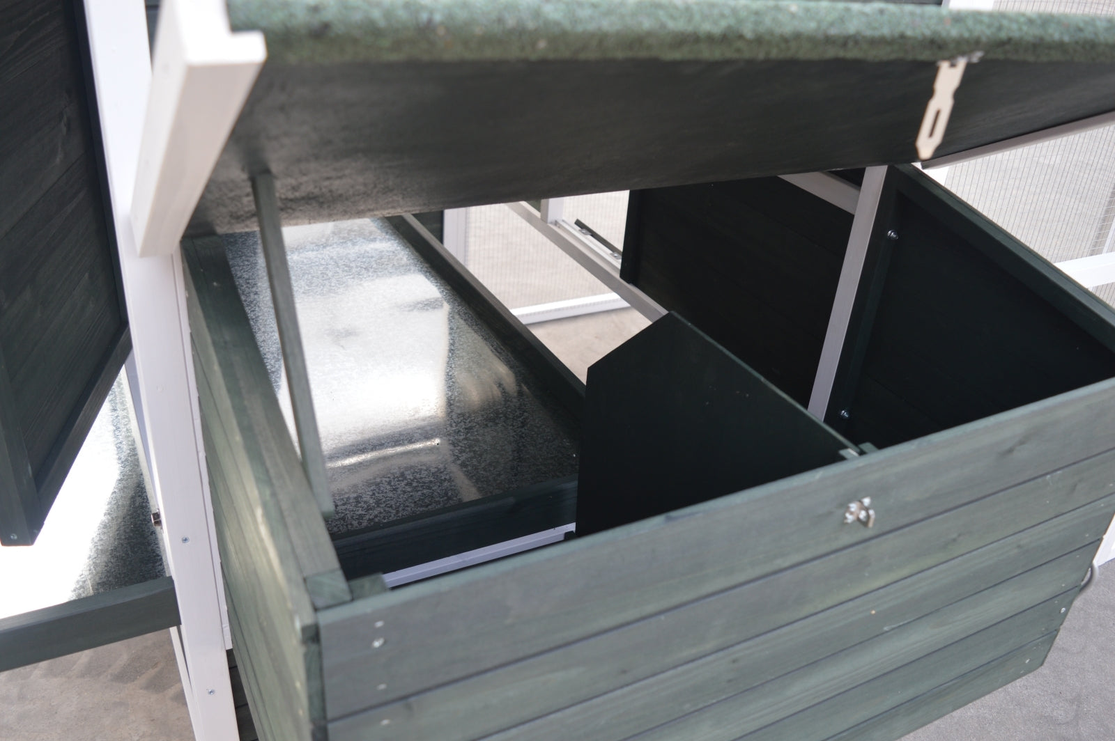 - Integrated nesting box and the roof of the nesting box can be opened for collecting eggs