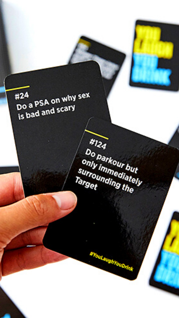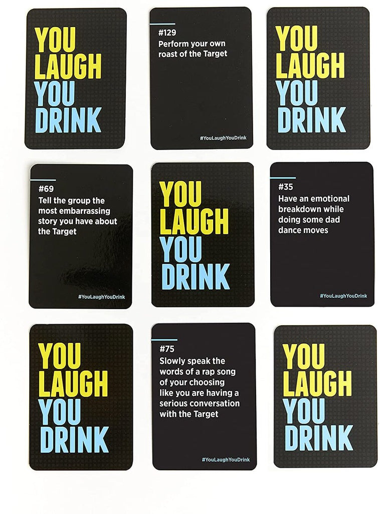 You Laugh, You Drink [A Party Game] is a party game for people who can't keep a straight face. On their turn, players pick someone [a target] in the group and have 30 seconds to make them laugh. Do what the card says and don't hold back!
